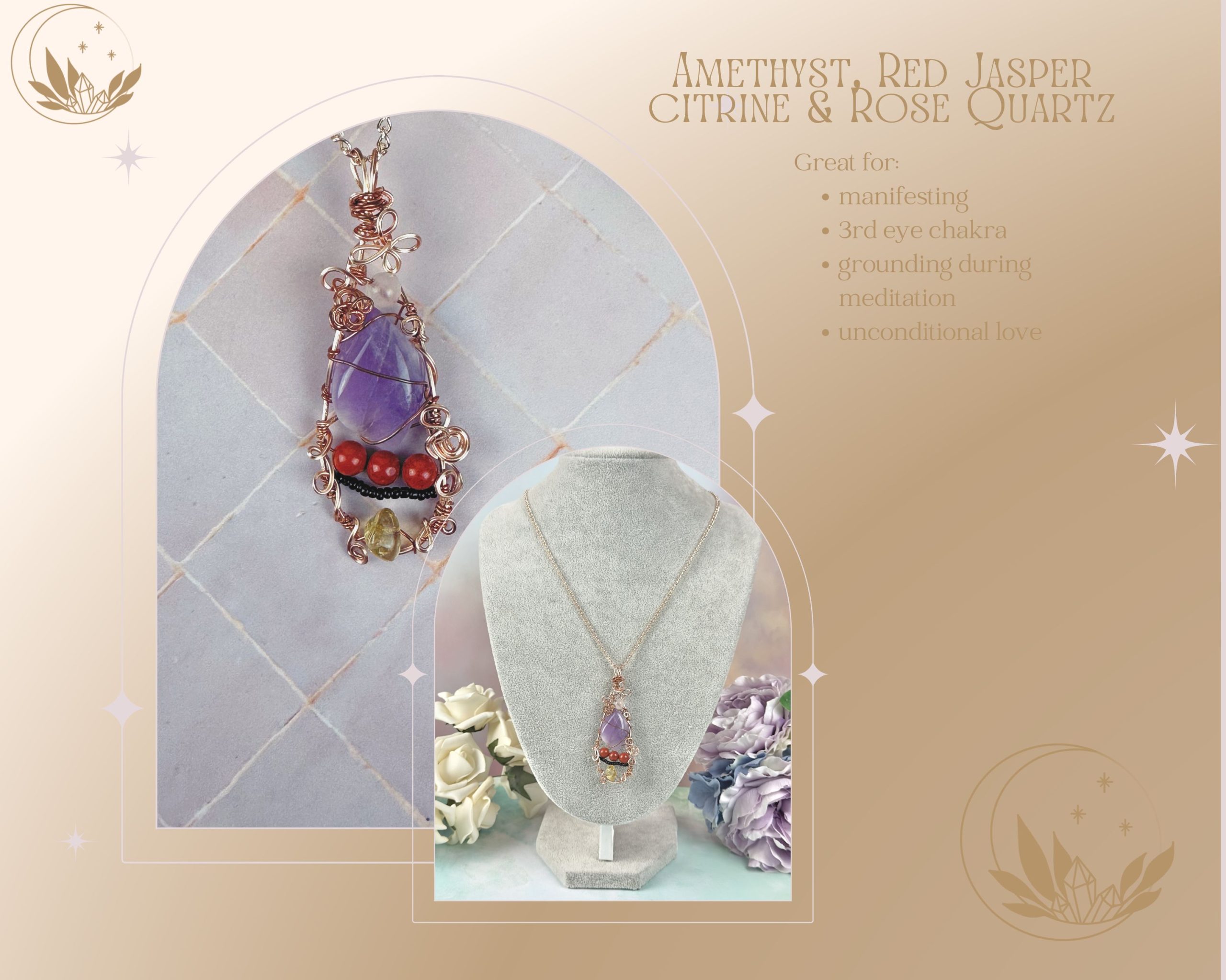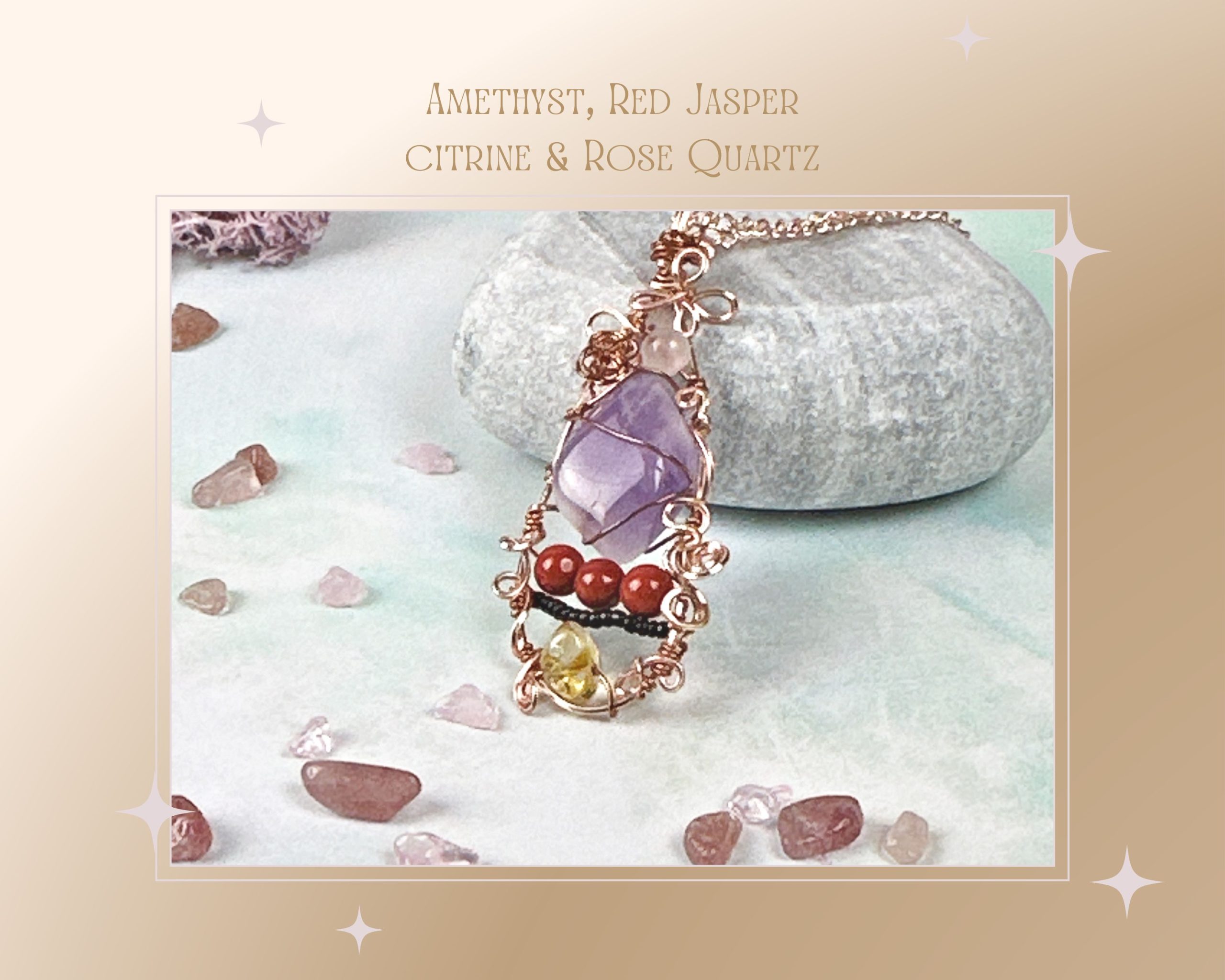 Amethyst Red Jasper Rose Quartz Citrine Pendant Necklace|Wire wrapped | Crystal Healing Jewellery
