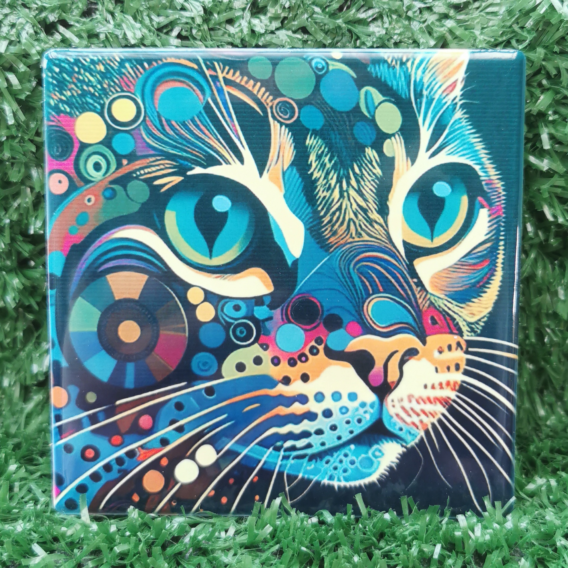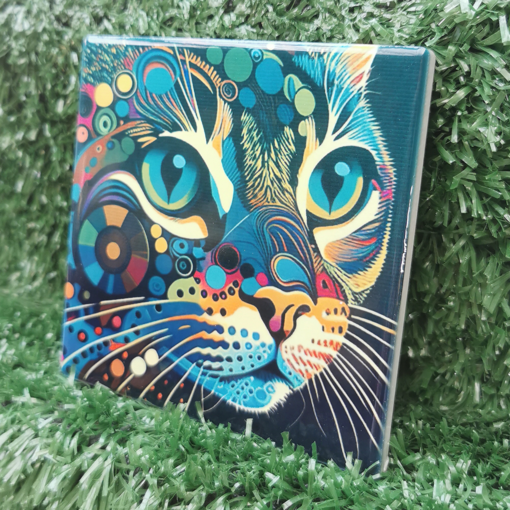 Brighten your living space with our Colourful, Vibrant, Abstract Cat Ceramic Coaster!