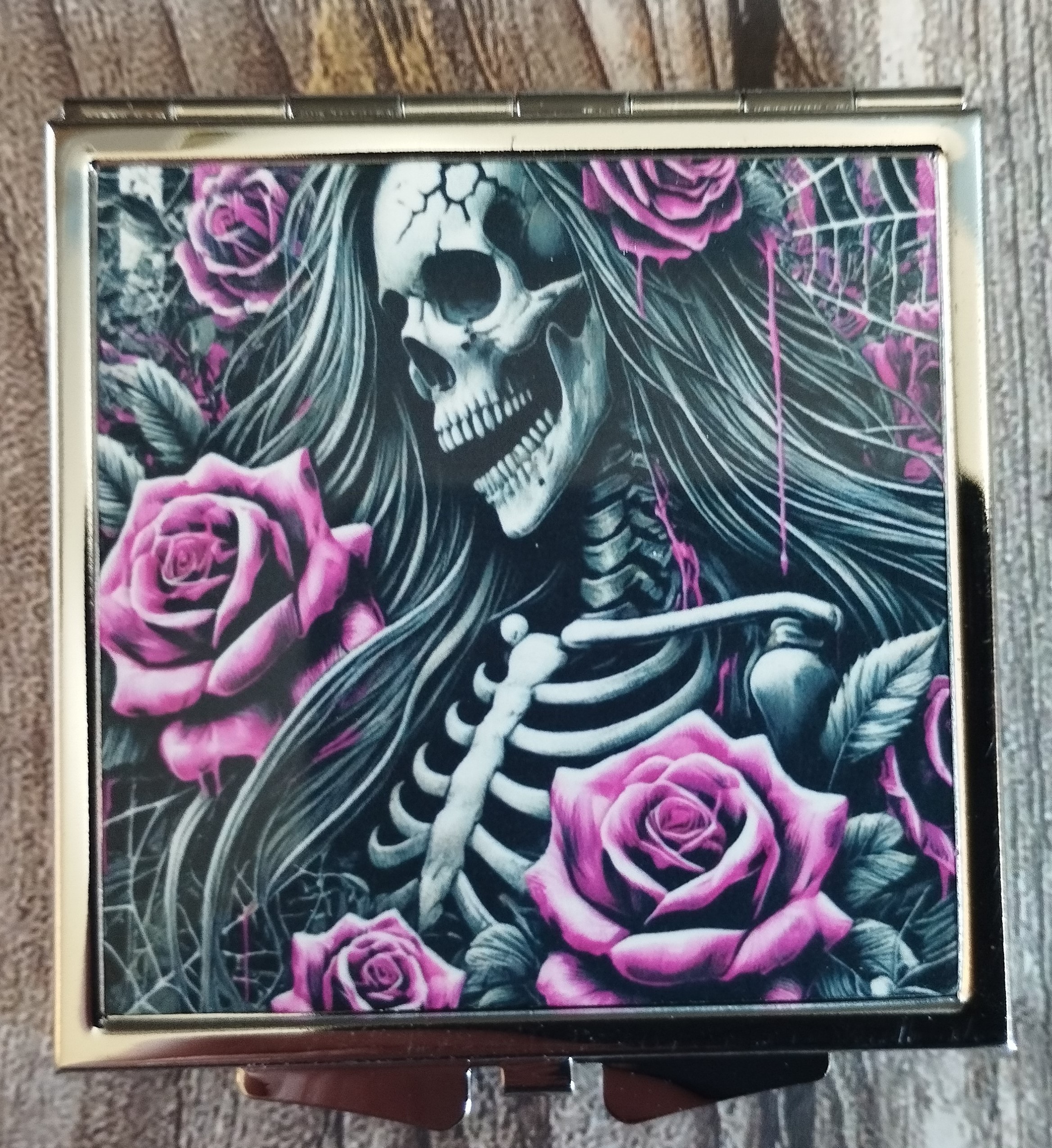 Discover our Compact Mirror featuring a stunning skeleton and roses design. This chic metal compact mirror is not only stylish but also practical, perfect for touch-ups on the go. Ideal for those who appreciate unique accessories, it adds a touch of gothic elegance to your beauty routine.