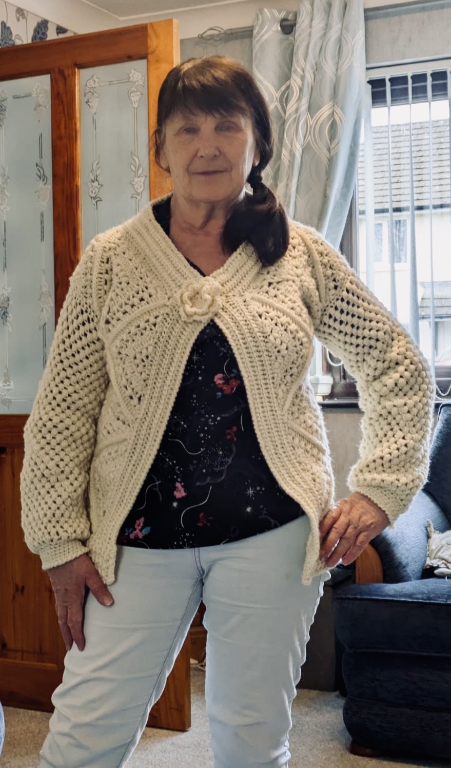 A hand crocheted cardigan made with a mixed yarn fibre of wool and acrylic. It can be machined washed at 30. The size is small/medium
