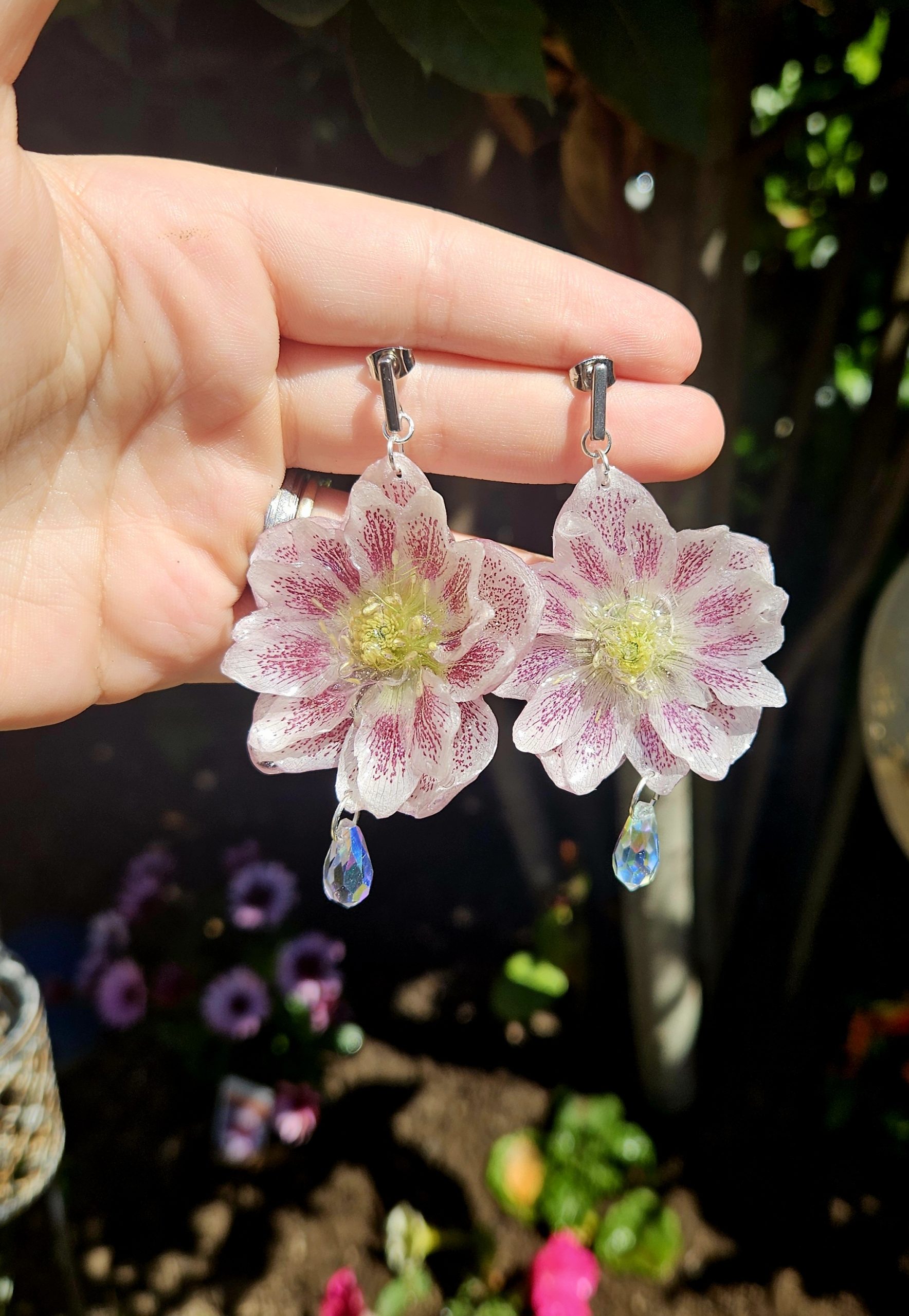 Delicate and dreamy, these handcrafted earrings feature soft blush hellebore flowers with intricate veining and luminous centers. Finished with a sparkling iridescent teardrop, they add a graceful, floral touch to any look.