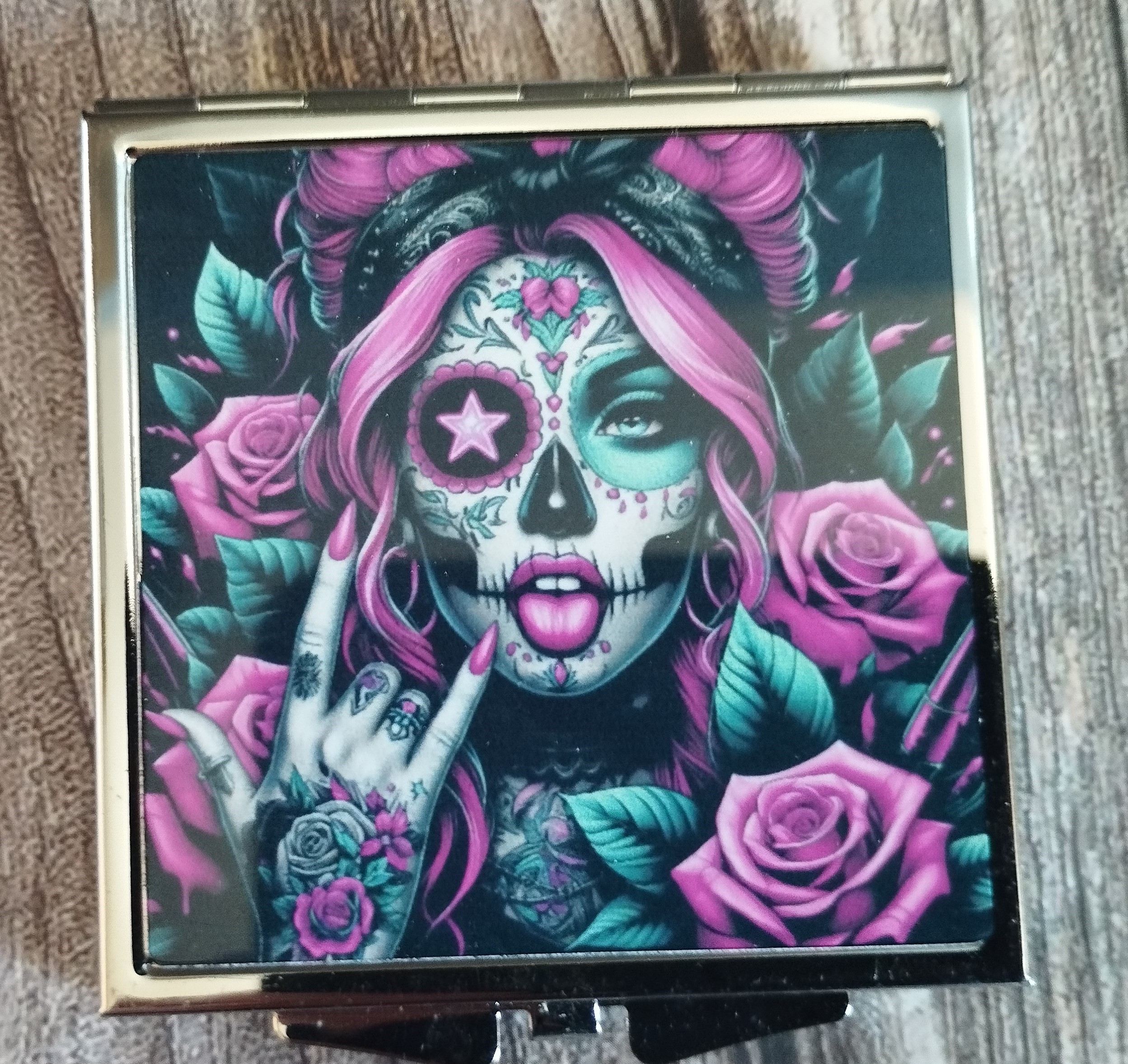 Introducing our Day of the Dead Compact Mirror, a stylish and functional accessory perfect for celebrating this vibrant tradition. Crafted from durable metal, this compact mirror features a secure clasp, ensuring that your mirror stays safely closed when not in use.