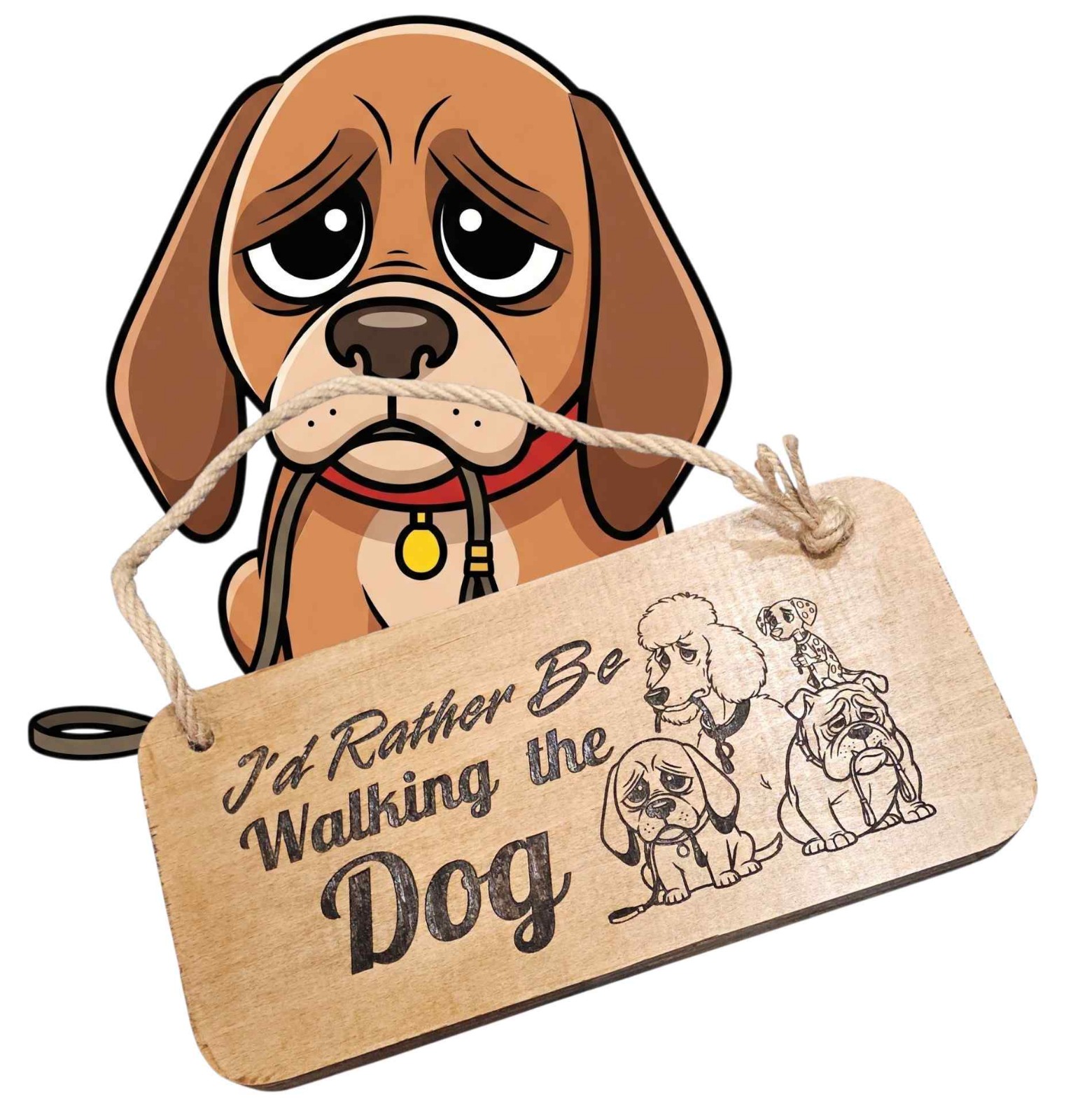 Engraved Double Sided Walking the Dog Hanging Rustic Wooden Sign. Introducing our laser engraved I’d rather be range — Double sided engraving on a 18mm thick heavy duty board then coated with an oak stain finish