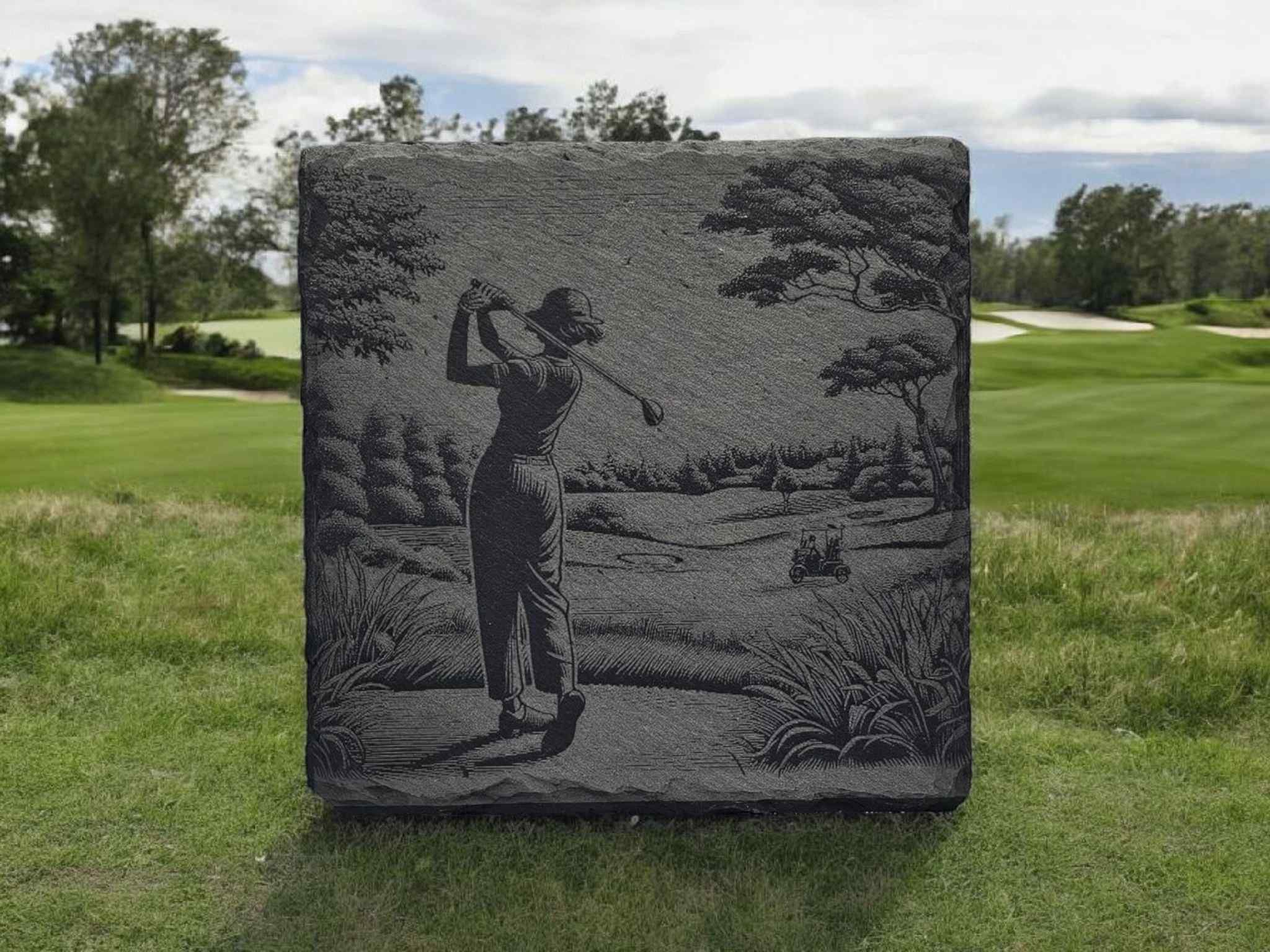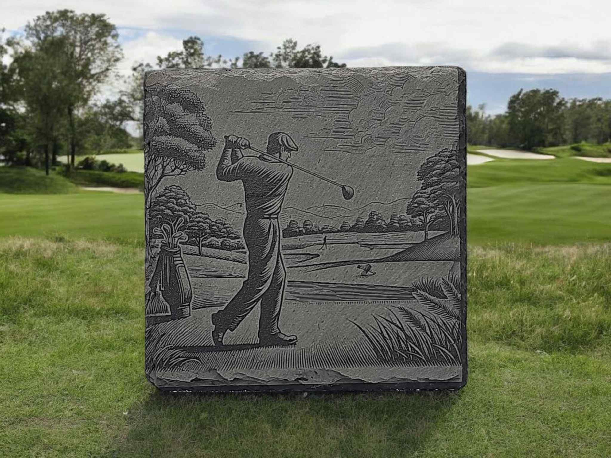 The intricate golfer design is laser-etched, providing a striking contrast against the dark slate, making it a perfect addition to any golf enthusiast’s collection. Whether used at home or in the office, this coaster merges functionality with style, delivering a touch of sophistication and a nod to your passion for golf. Ideal as a gift for fellow golfers or as a charming addition to your own decor, it embodies both artistry and practicality.