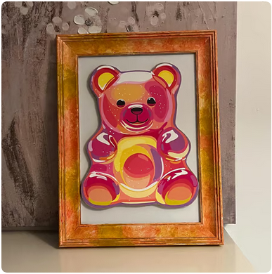 Handmade 3D gummy bear art print, beautifully framed in a hand-painted orange and pink wooden frame. Featuring glossy, candy-inspired layers and bold textures, this unique piece is perfect for brightening up modern interiors, quirky gallery walls, or gifting to sweet-loving art fans. Ideal for bedrooms, playrooms, or creative spaces.