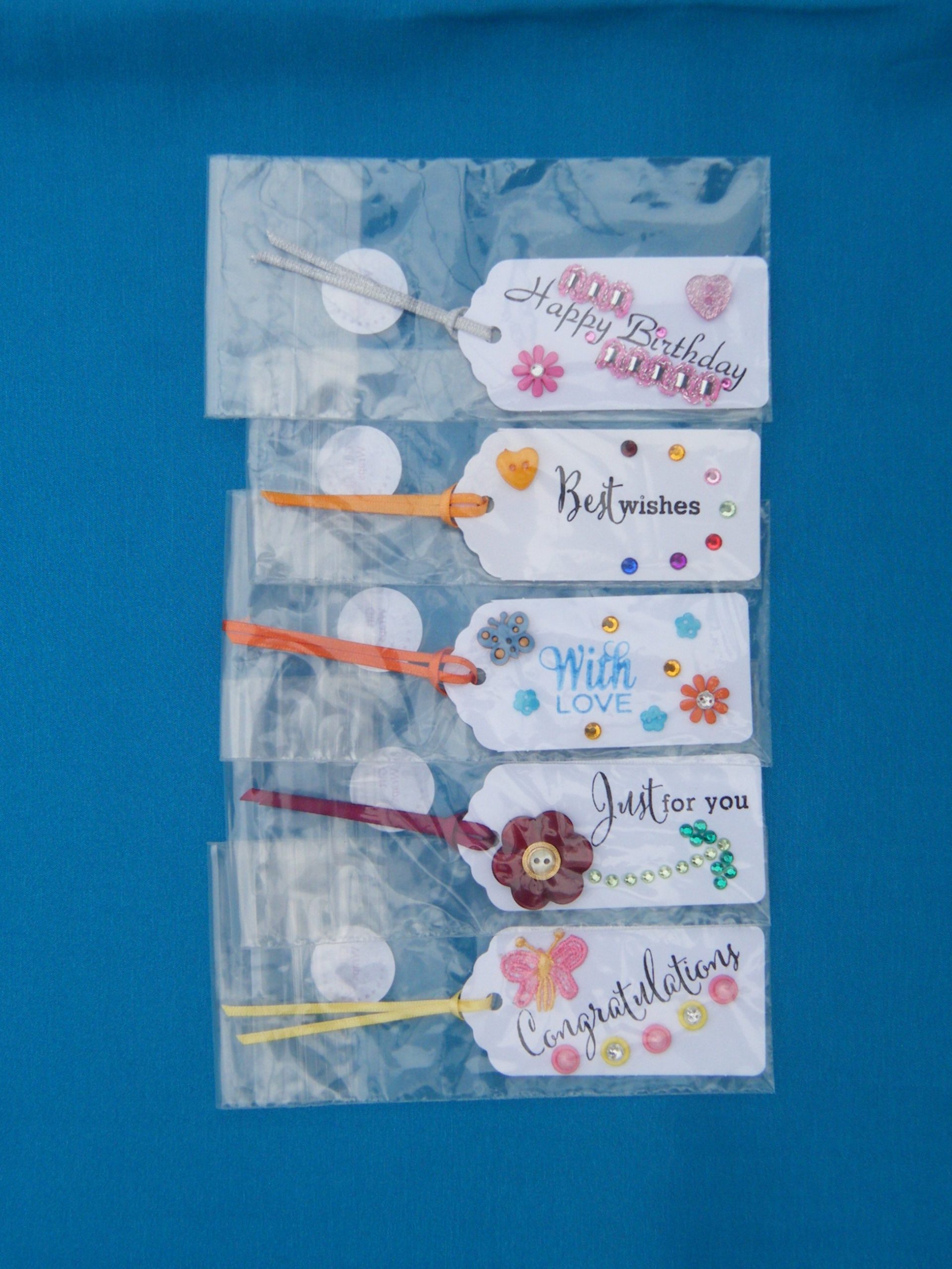 These hand decorated and hand stamped gift tags all feature what I love the most – colour, bling and ribbons! Great to use with one of our gift bags.