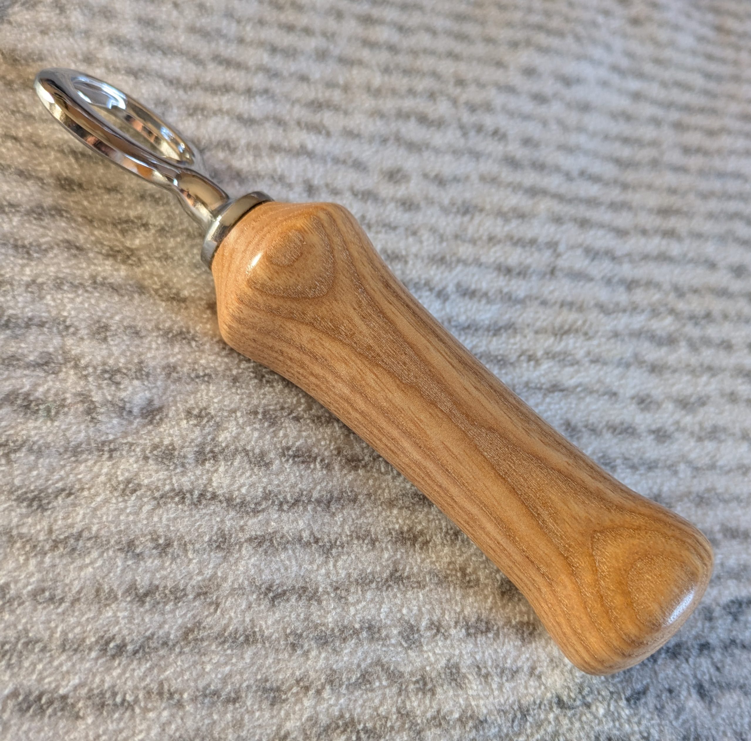 A beautiful handcrafted ash bottle opener, a light coloured wood with a striking grain enhanced by a lovely gloss finish with a stainless steel opener
