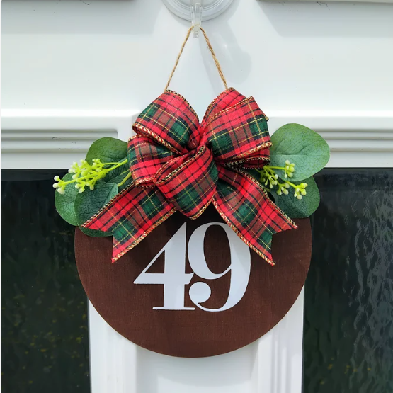 Tartan bow and artificial eucalyptus to add finishing touch to your signYear Round Front Door Sign, decorate your door or wall for all seasons will be finished with house number
