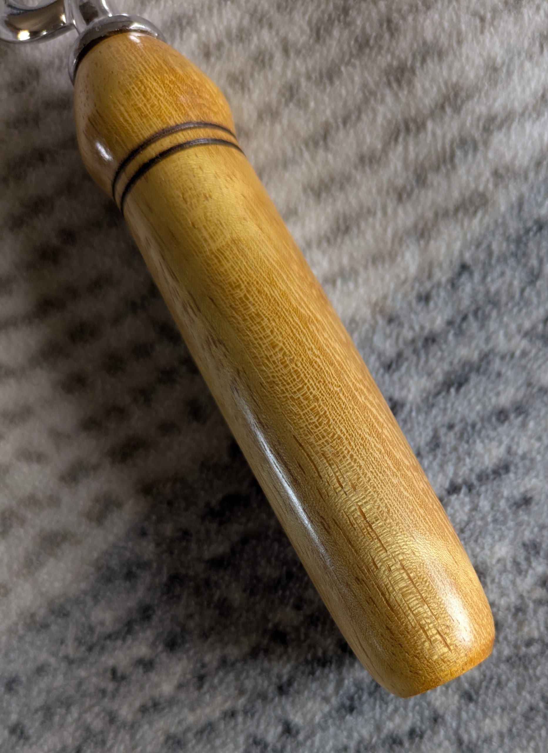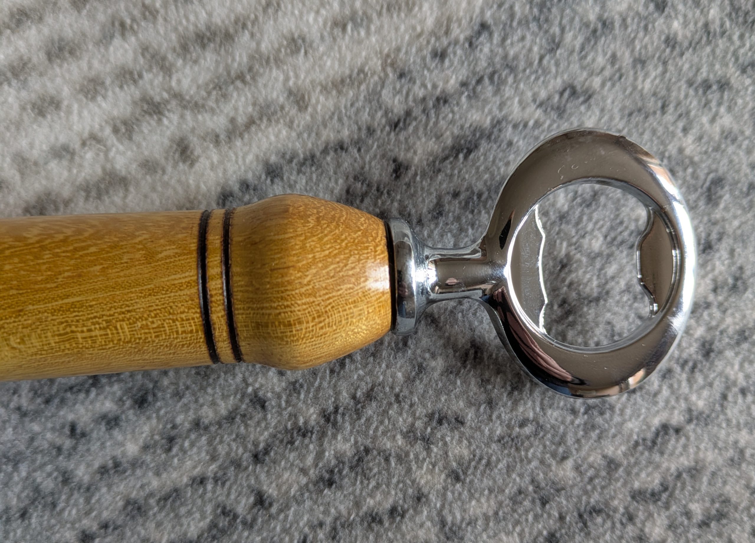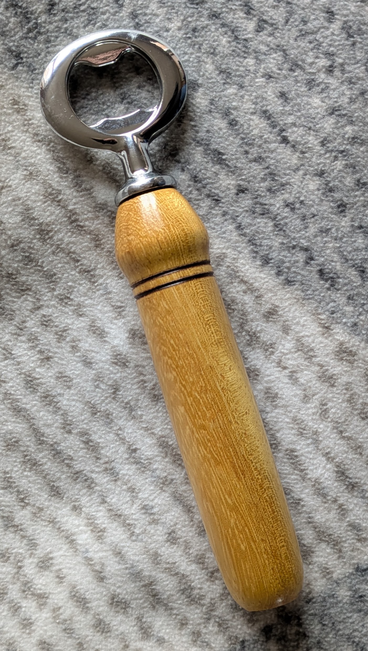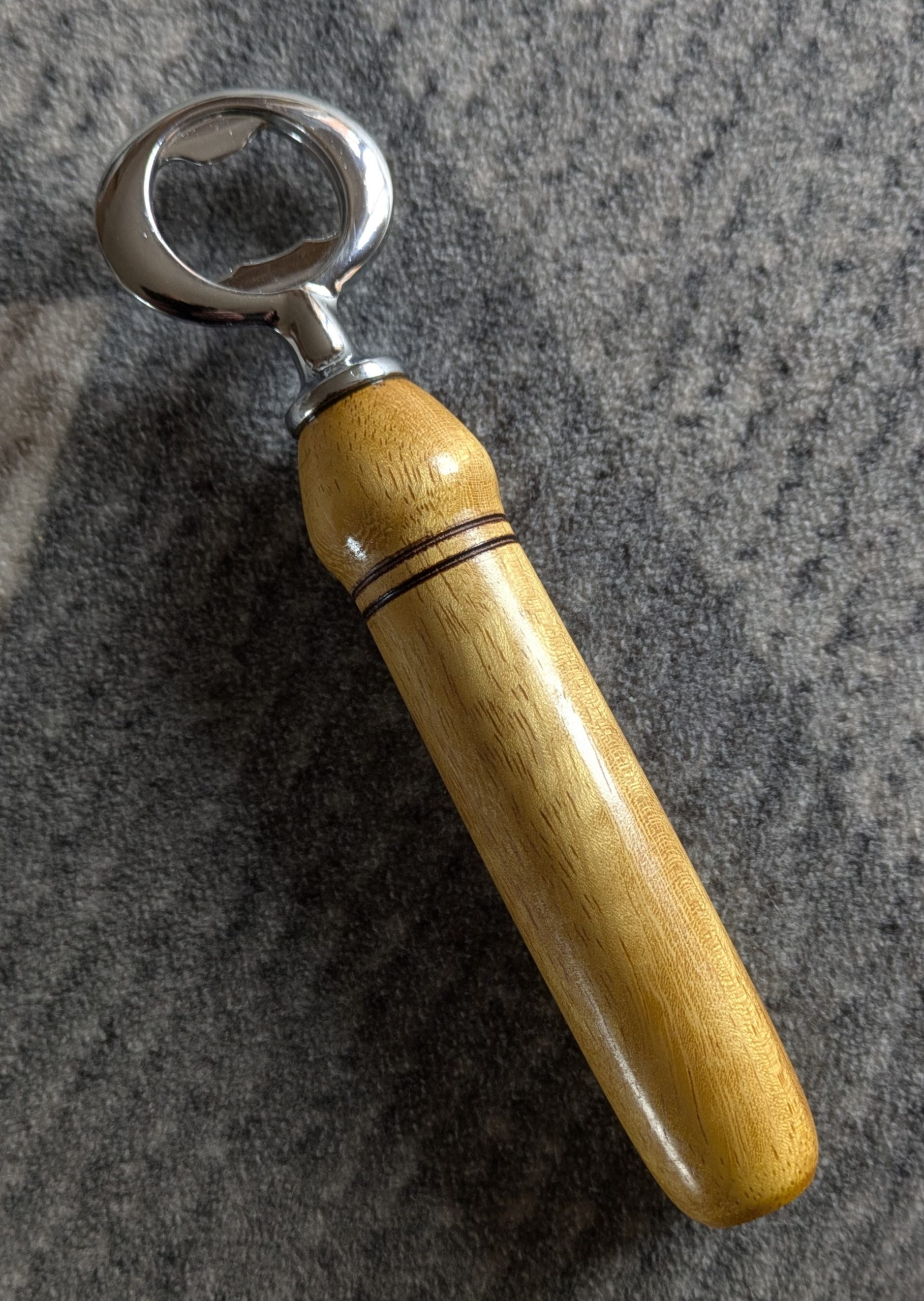 A lovely hand crafted Bottle opener made from durable Iroko wood enhanced with two accent rings and a stainless steel opener