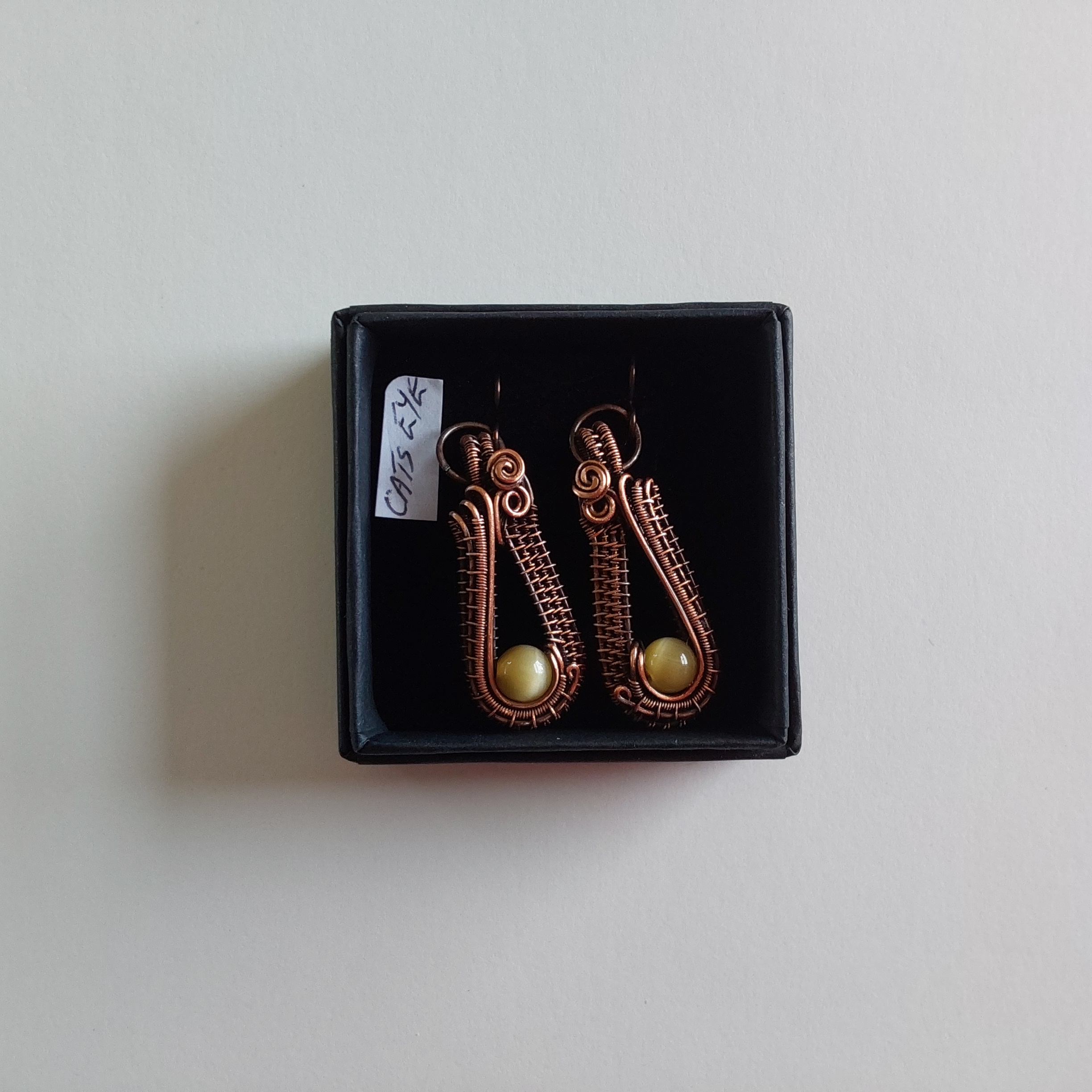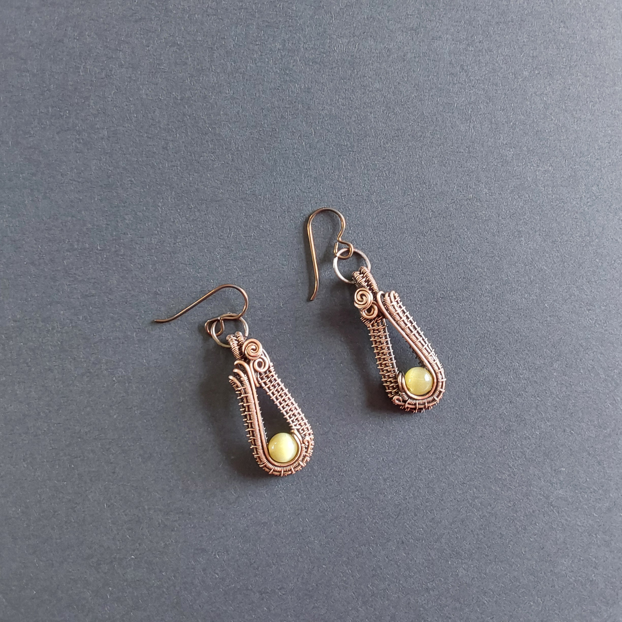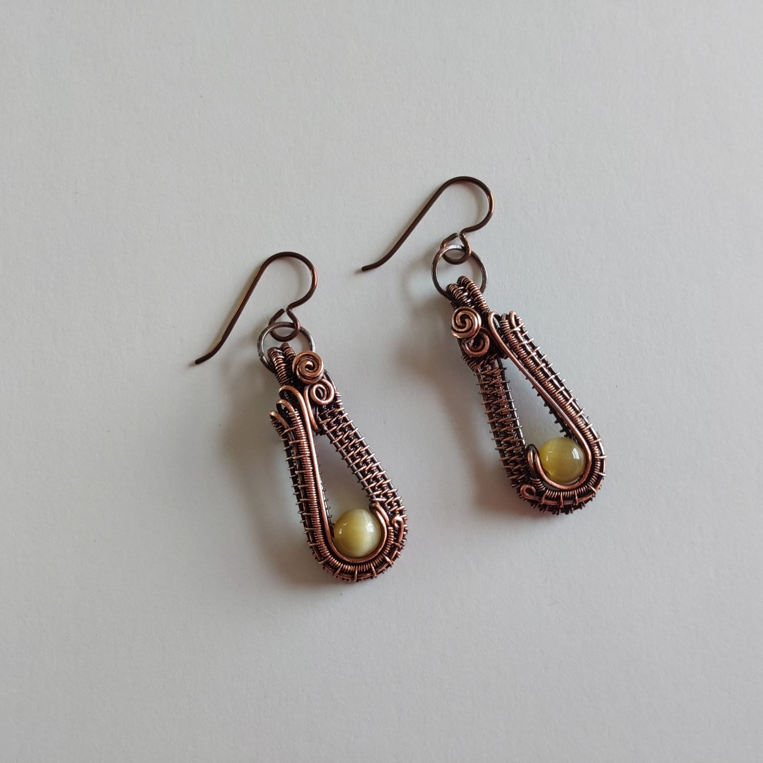 Handmade wire weave Cats Eye earrings in copper, with Niobium hypoallergenic ear wires. Self designed and handmade wire weave earrings in copper. Created using two different wire weaves and featuring lovely Cats Eye beads in a yellowish amber colour.