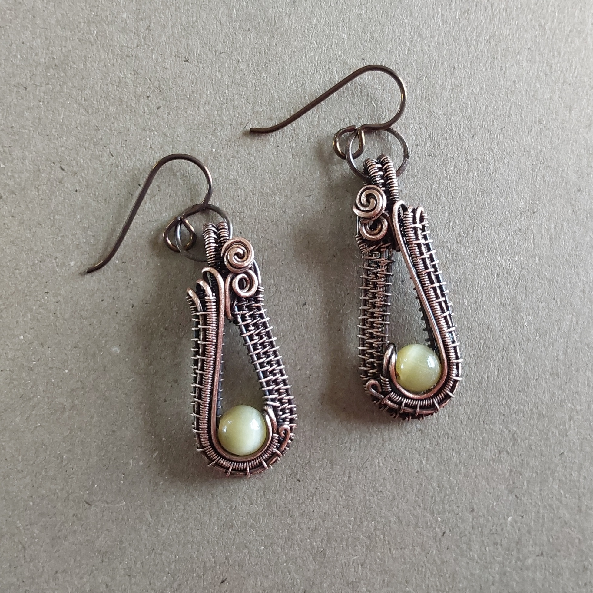 Handmade wire weave Cats Eye earrings in copper, with Niobium hypoallergenic ear wires. I used 0.7 mm bare copper base wires and did my weaving across them with tiny, 28 gauge copper wire. I used bare wire to mirror the shape of the wire weaving, and also to add two decorative spirals at the top of each earring.