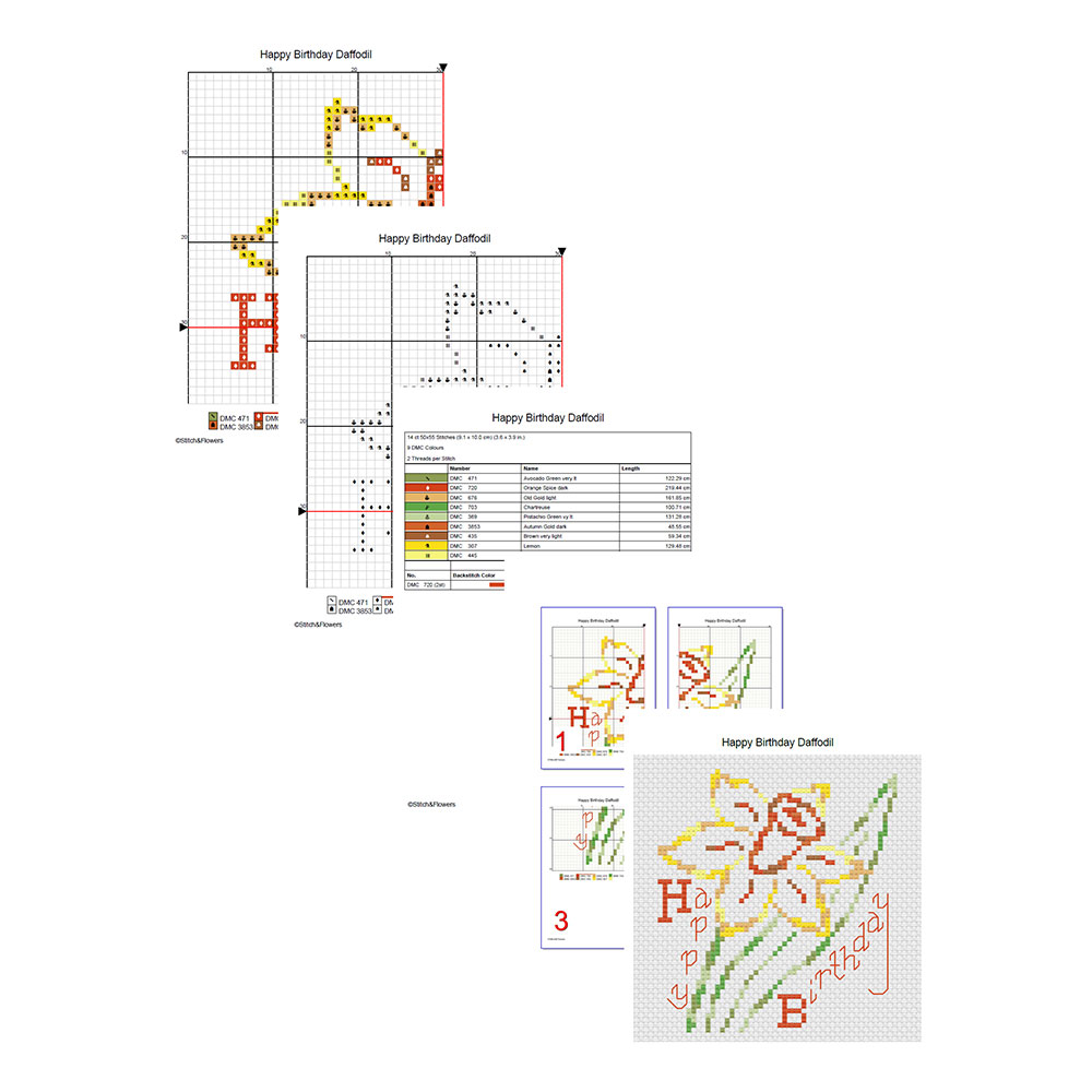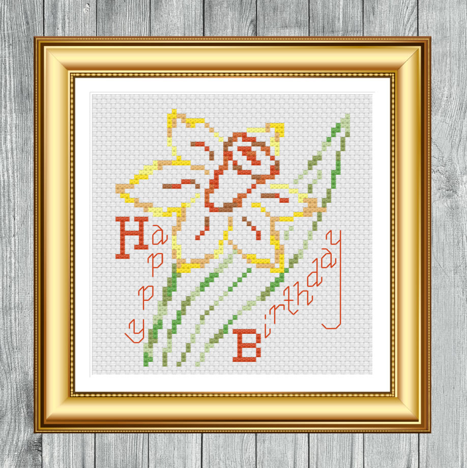 Happy Birthday Daffodil Flower Cross Stitching Pattern, Instant PDF Download, Card Making