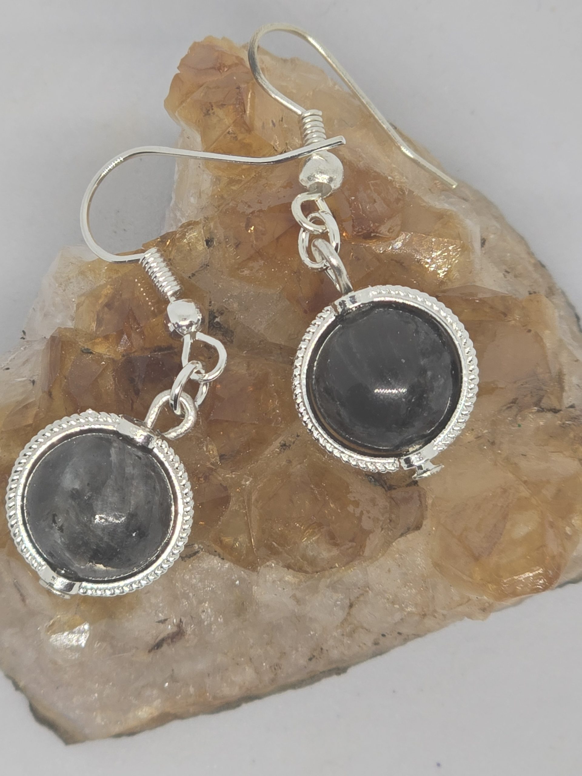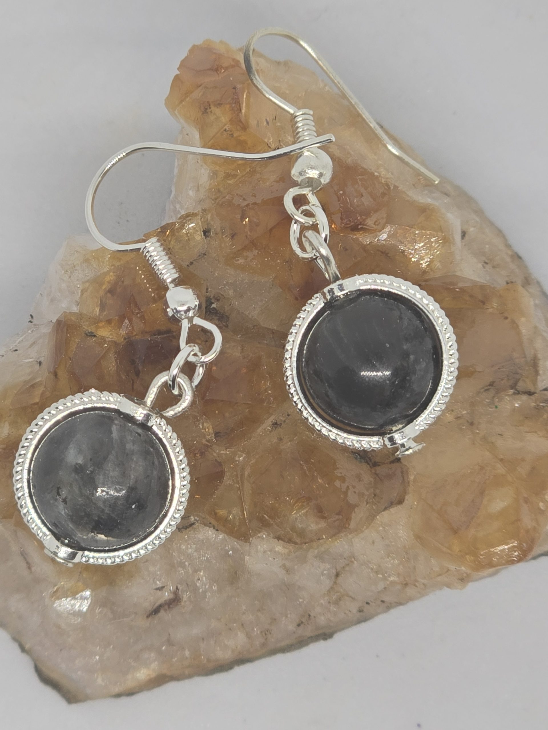 Labradorite beads, surrounded by silver coloured circles. With 925 silver earring hooks. Drop is approximately half “, lightweight and comfortable to wear.