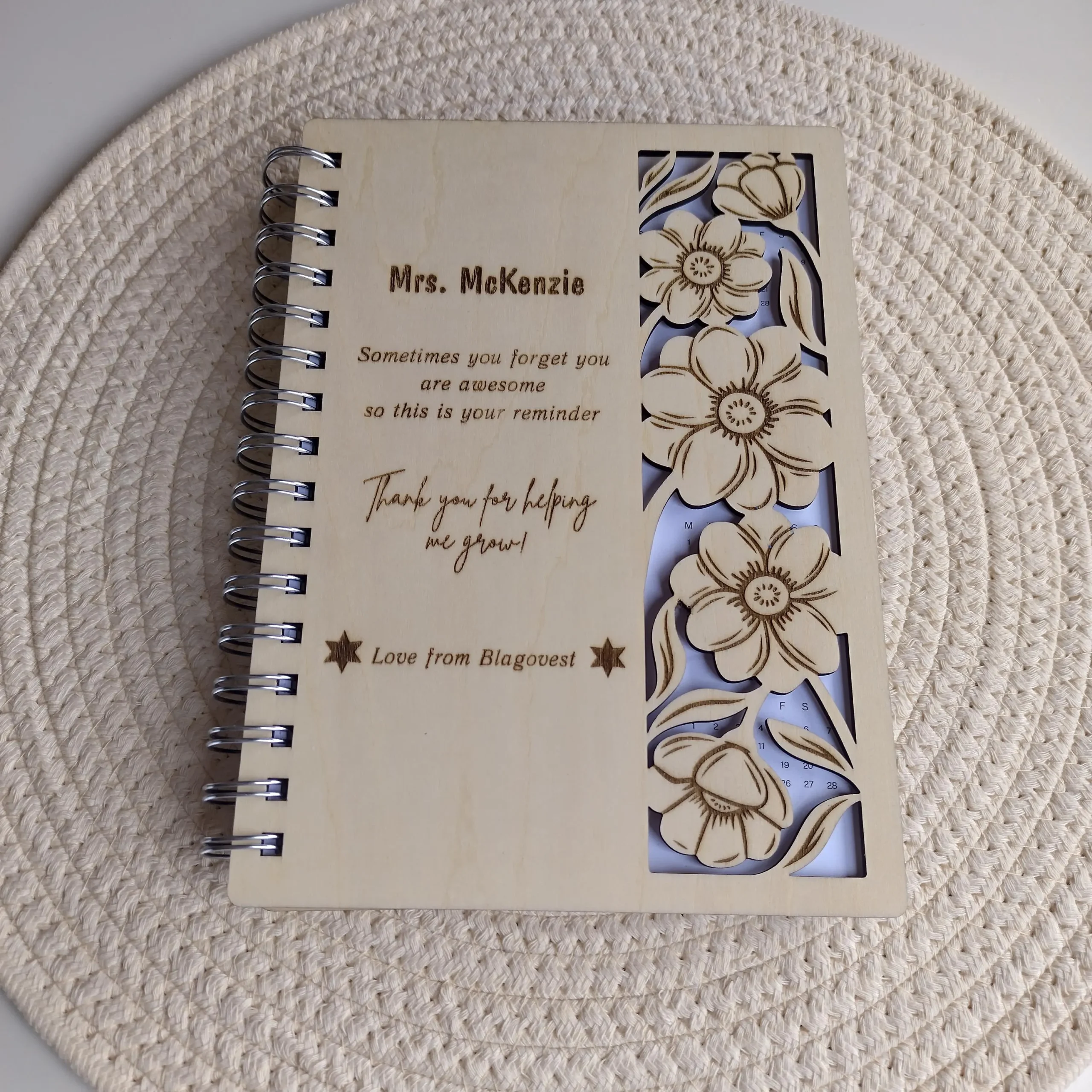 Each item is laser-engraved with a meaningful quote and decorated with intricate floral cutout designs, creating a rustic yet refined look. Whether it’s the end of the school year, Teacher Appreciation Week, graduation, or a simple thank-you, this gift set makes a lasting impression