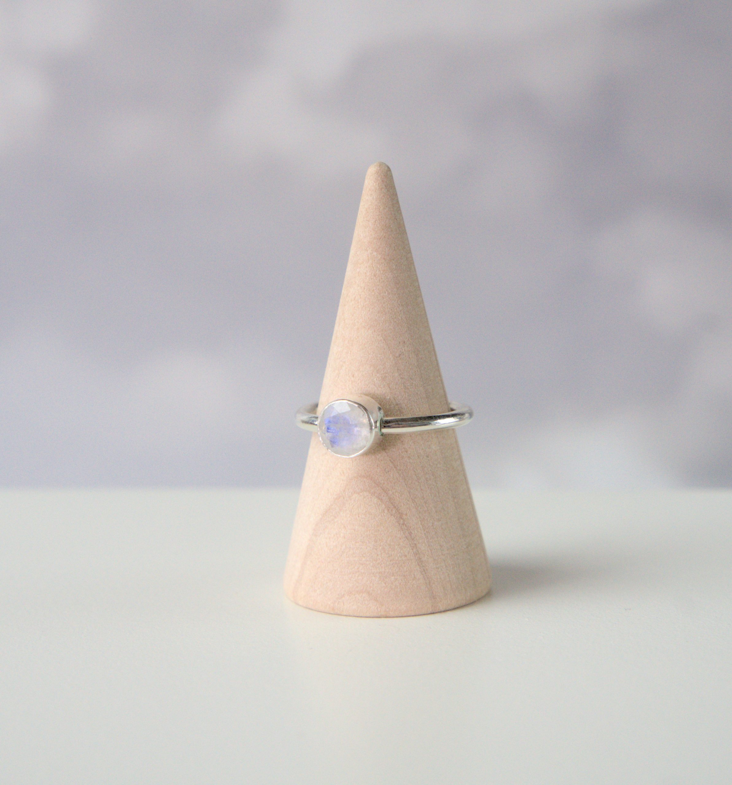 No matter what phase of the moon is in the sky, this one will be full, round, and gleaming. This ring features a 6mm moonstone set in a bezel, on a plain 2mm recycled silver band.