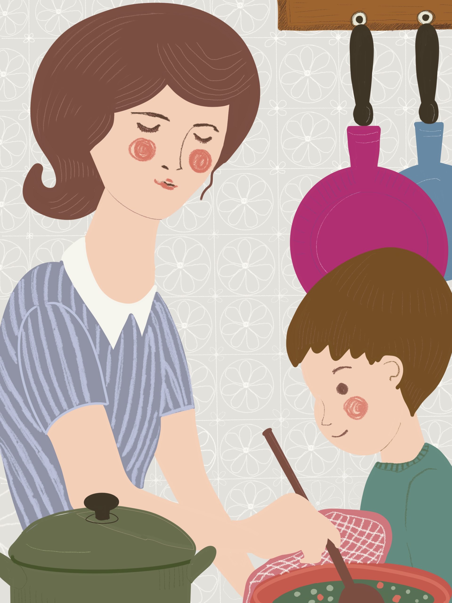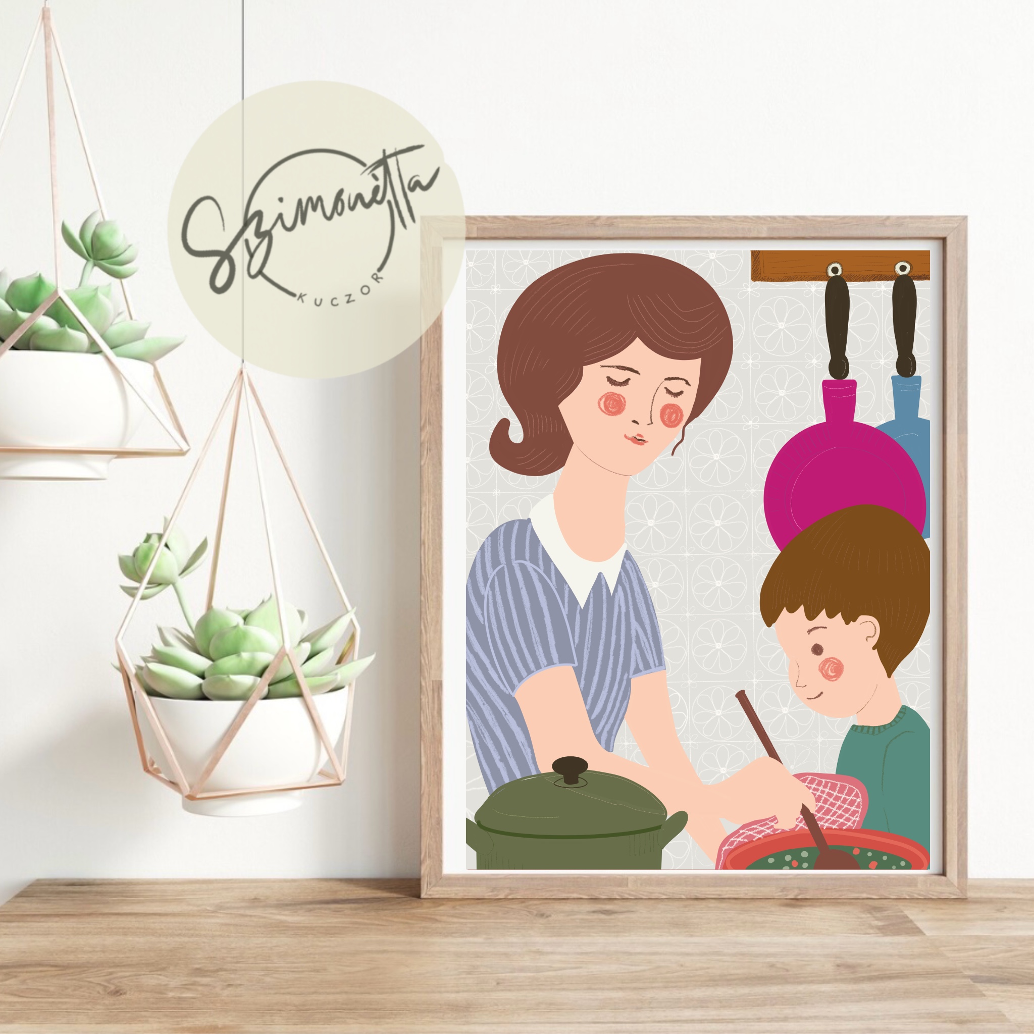 Explore the charming illustrations by Szimonetta, where a mother and son are cooking together, as mom is the best cook.