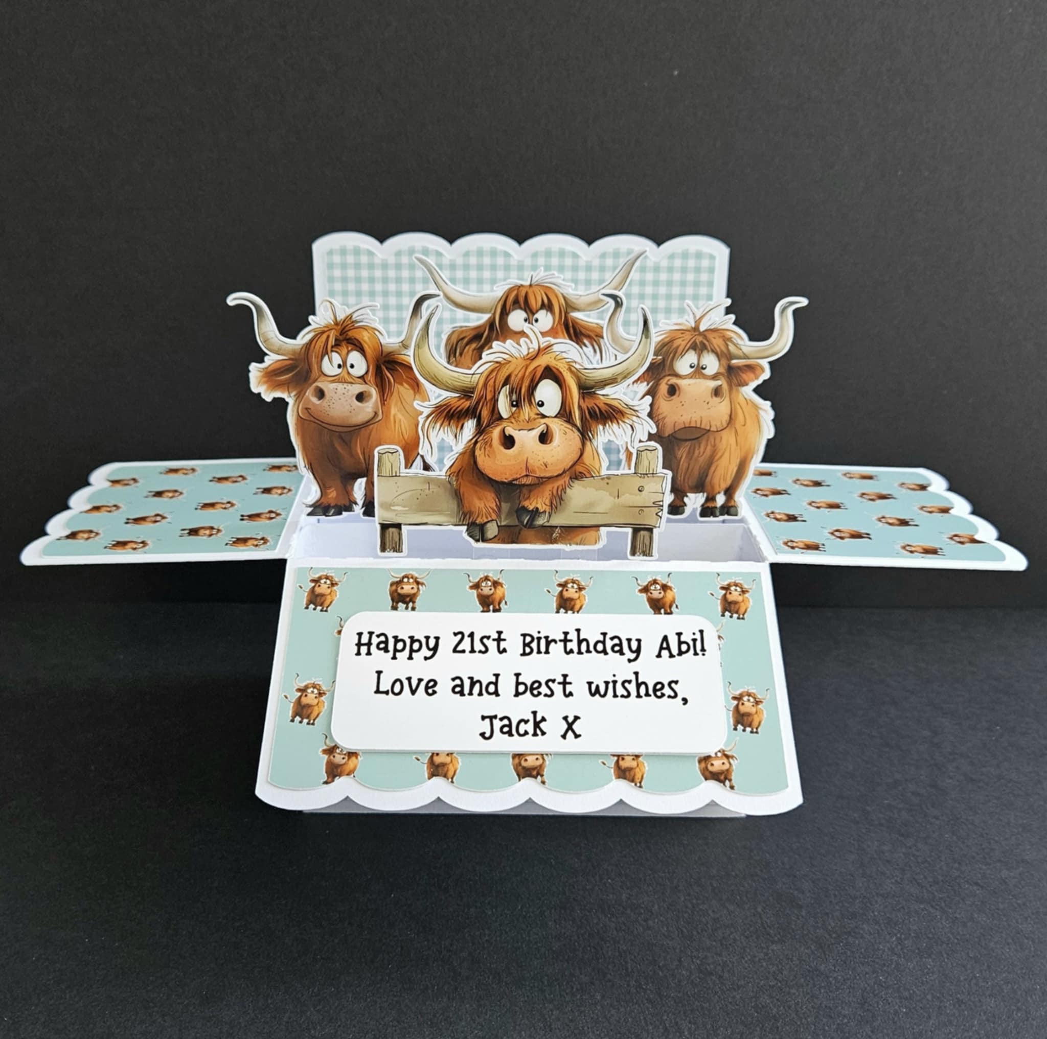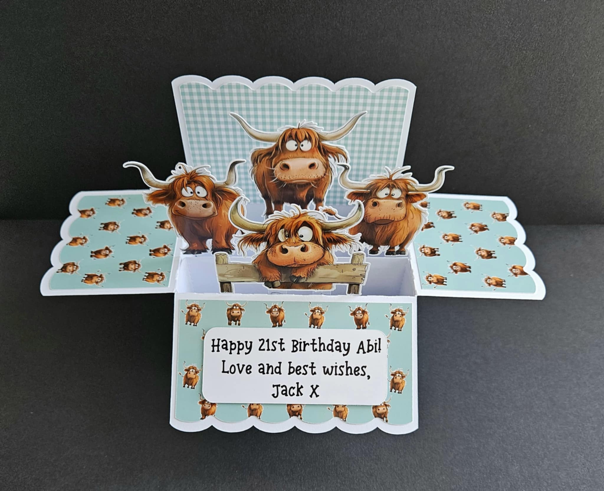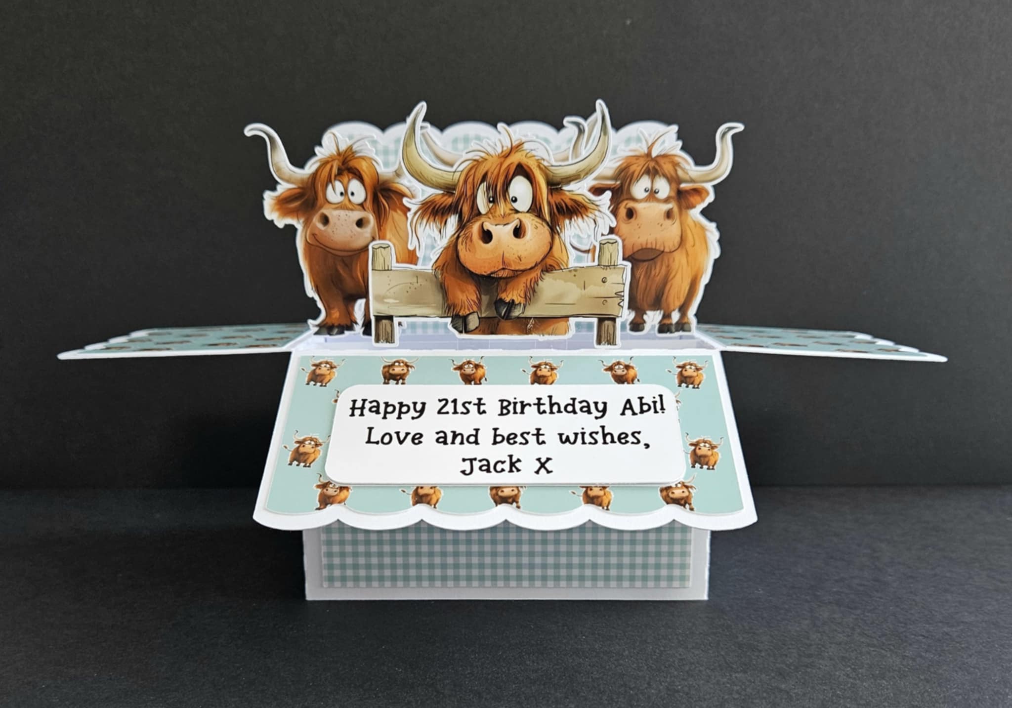 Celebrate special moments with our **Highland Cow Personalised Birthday Box Card Popup**! This unique handmade card features an adorable Highland cow design that pops up to bring joy to any birthday celebration. Crafted with care, each card can be personalised with the recipient’s name, making it a thoughtful keepsake.