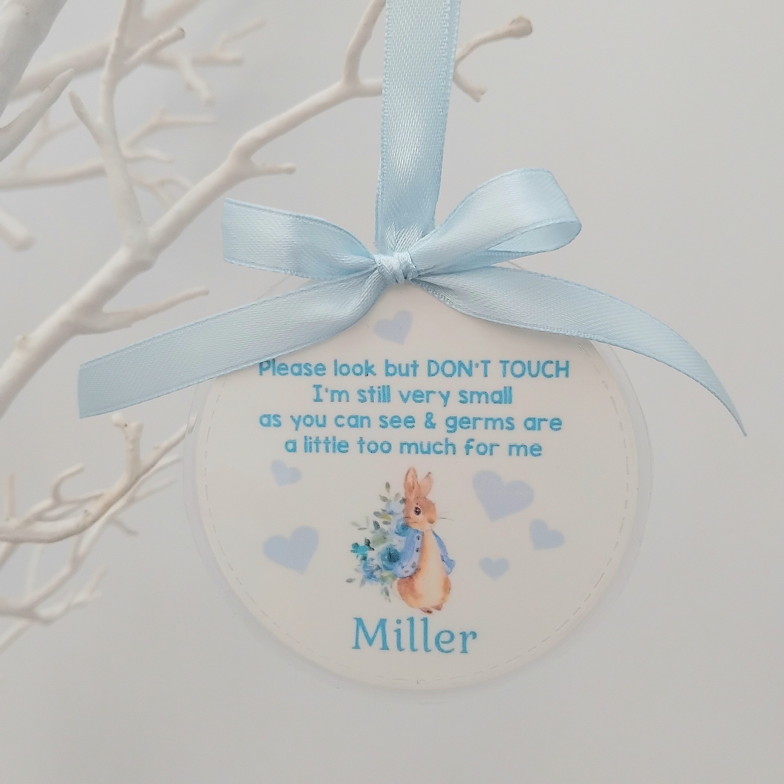 Personalised Peter Rabbit Pram Charm, Please Don’t Touch Your Germs Are Too Big For Me Pram Tag