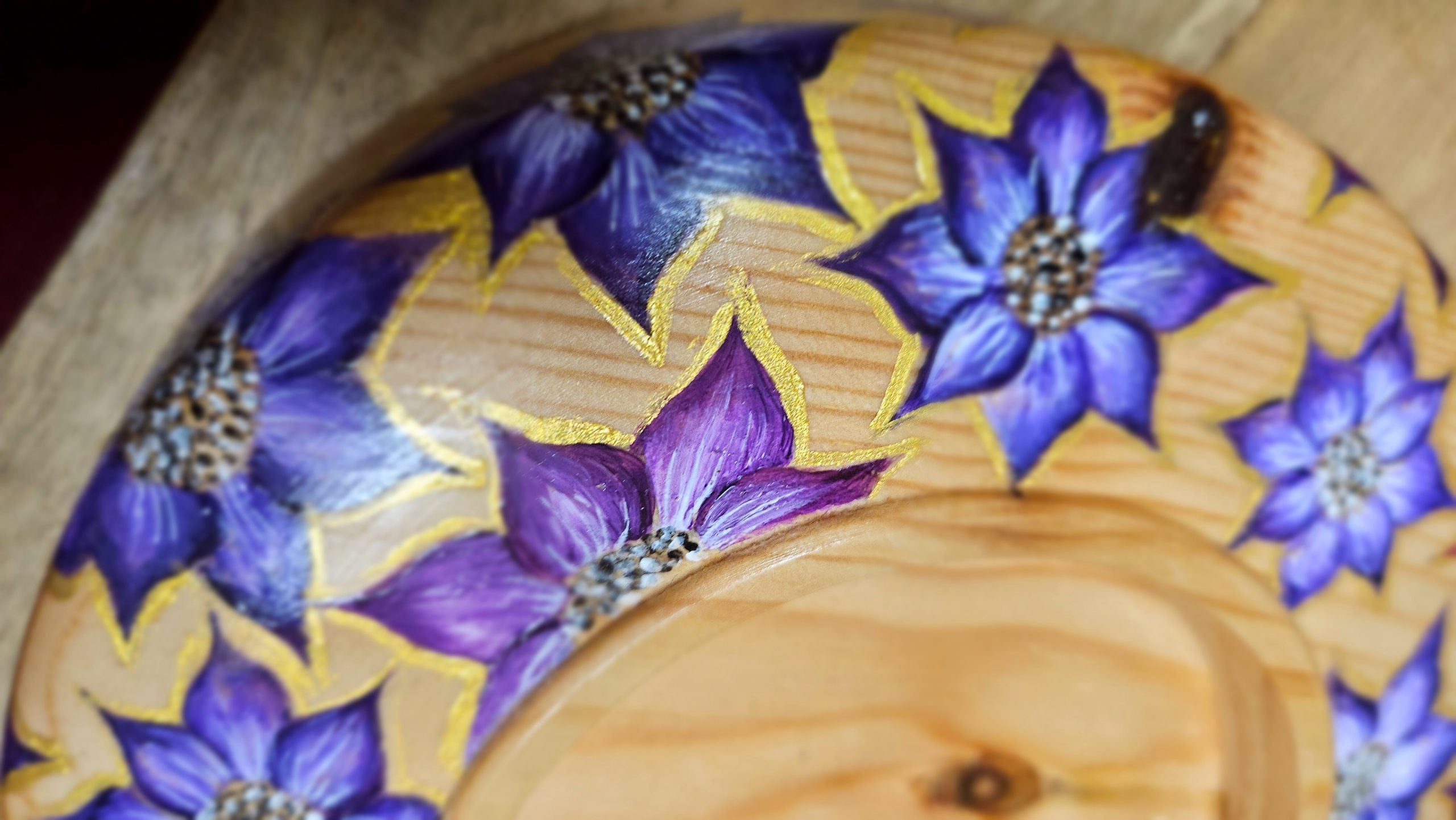 This wood turned pine candle holder has been hand painted with purple and pink flowers with gold edging in acrylic paint. 6.5” wide x 2” tall.