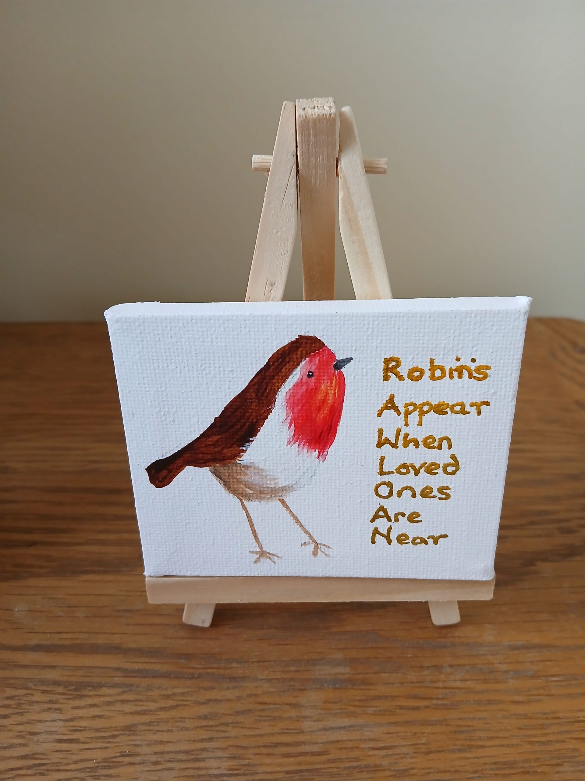 Discover the enchanting Robin mini canvas and easel, featuring a beautifully hand-painted robin and heartfelt wording: “Robins Appear when loved ones are Near.” Perfect for easy display, this charming piece adds a touch of warmth to any space, making it an ideal gift for loved ones or a delightful addition to your home decor.