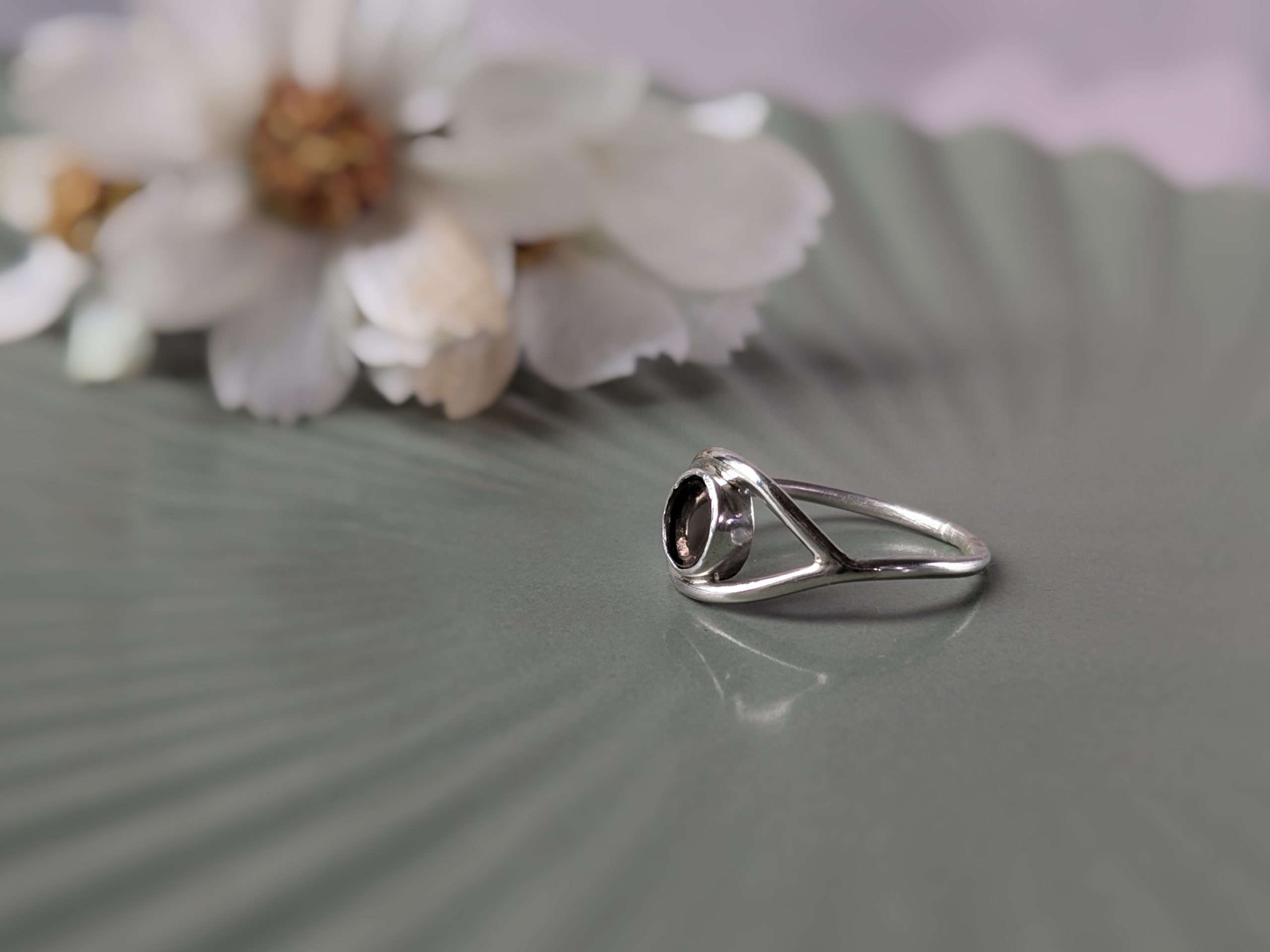 A handmade recycled sterling silver ring with smoky quartz.