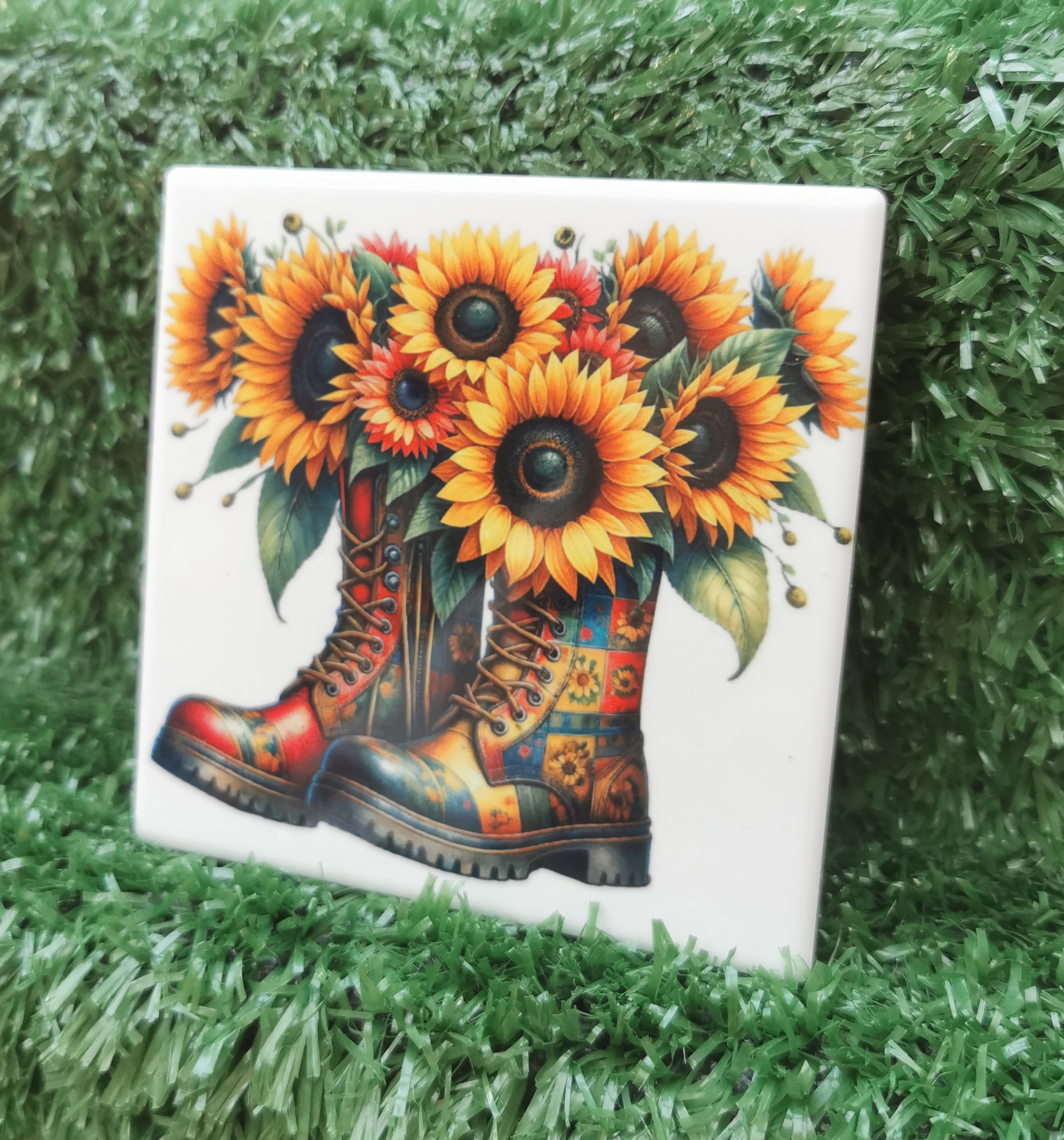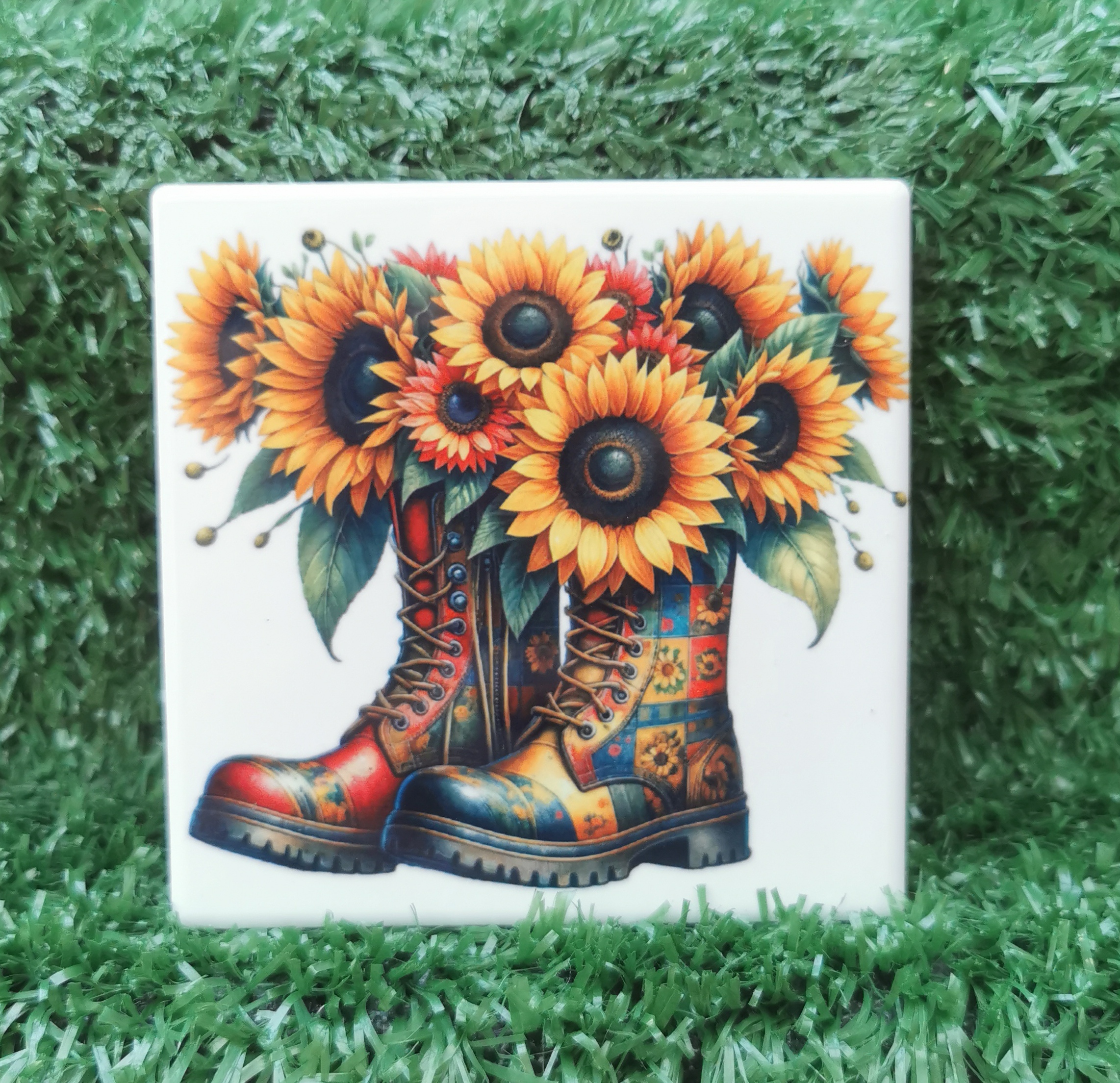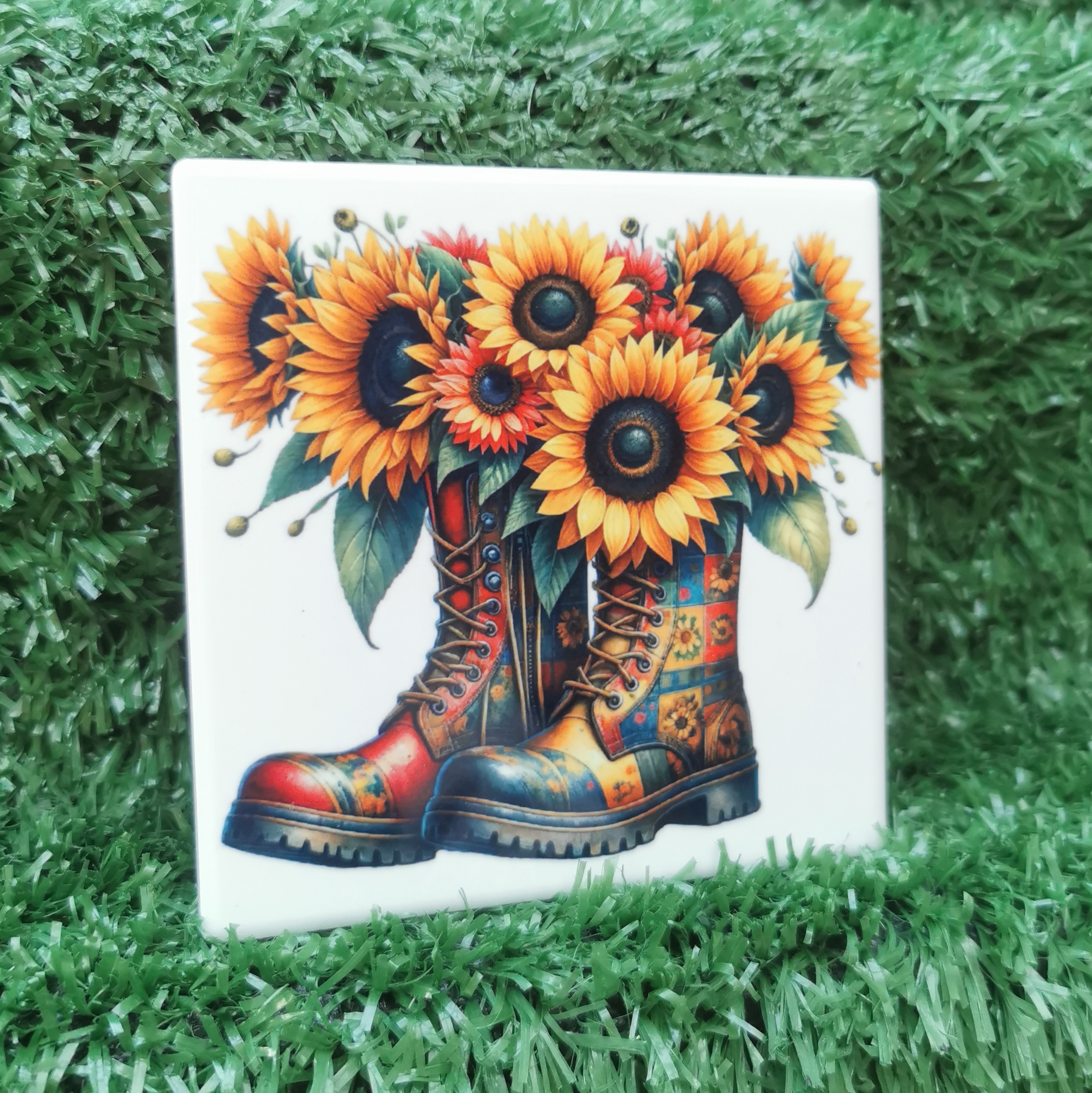 Introducing our Vibrant, Colourful Garden Boots with Flowers Ceramic Coaster – a perfect blend of functionality and artistic charm!