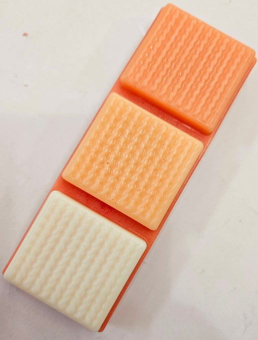 Cashmere Sweater Cosy/ Musk Scent, A beautiful fruity floral fragrance opening with rich blackberry, sparkling pomegranate and wild grape, supported by a white floral heart of freesia, lily, magnolia and violet, all resting on a soft cashmere and musk base., 50g Wax Melt Snap bar in a Clamshell.