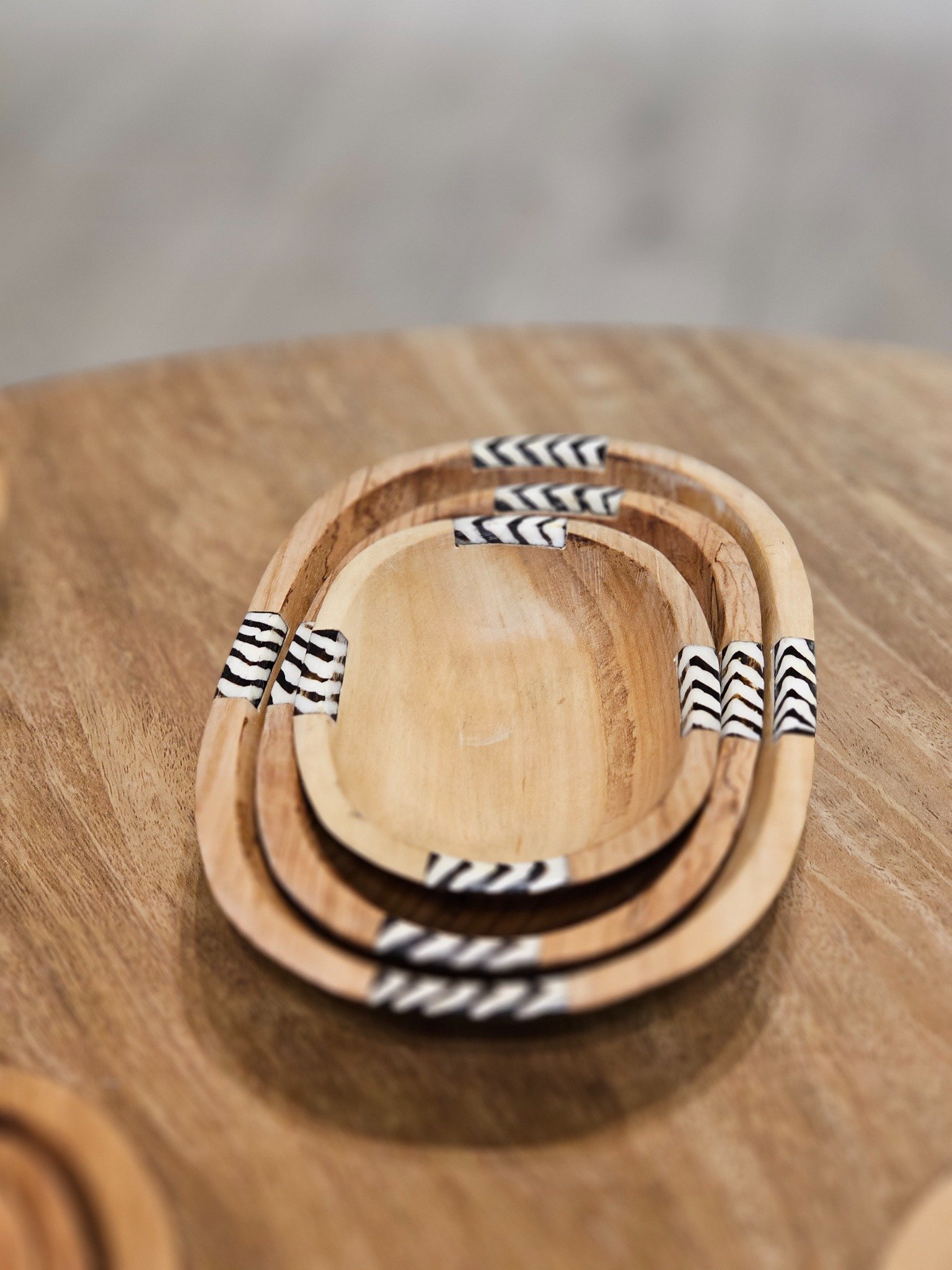 Upgrade your home with these beautifully handcrafted wooden serving trays, perfect for serving, decorating, or gifting. Made from high-quality natural wood, these oval trays feature intricate hand-painted black-and-white tribal patterns, adding a unique touch to your kitchen or dining space.