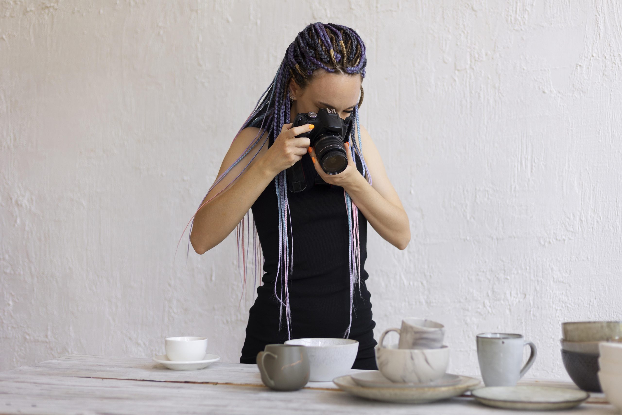 - Busy backgrounds. The patterned tablecloth has to go. So does the cluttered shelf in the background. Plain. Plain. Plain.